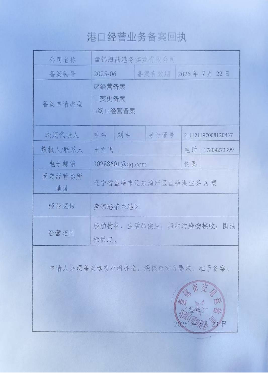 盘锦海韵港务实业有限公司成立于2011年(前身为盘锦海韵燃料油有限公司,2018年变更为盘锦海韵港务实业有限公司)。是船舶污染物接收,港区作业码头防污染监护及海上溢油应急和搜救的专业化公司。交通部海事局核验认定的一级清污资质企业,是盘锦海事局辖区海面防污,清污,应急抢险搜救的主要力量。担负盘锦海域及作业港区的防污染监护,应急清污处置,等相关配套服务,与全国350余家船务公司签订船舶防污染清污协议,2017年,两次为盘锦海域沉船打捞,提供防污染监护。2023年参加辽宁省海上搜救演练。公司注册资金500万元,资产总值3200万元以上,公司员工80余名,(其中海上溢油应急处置高级指挥5人,现场指挥6人,应急处置抢险队员40人)大型应急处置船舶2艘,中小型辅助应急处置船舶8艘,大中型海上溢油回收设备8台套,各种应急物资充足,能够保障盘锦海域海上溢油处置的供应。公司始终如一地将保护海洋环境为己任!是美丽海湾的倡导者,碧海盘锦的践行者!