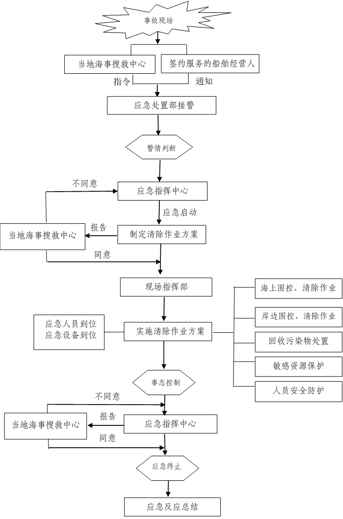 在清污作业方案得到主管部门认可后,应急响应由应急指挥中心组织实施,具体按照以下程序和内容进行(见图1)。